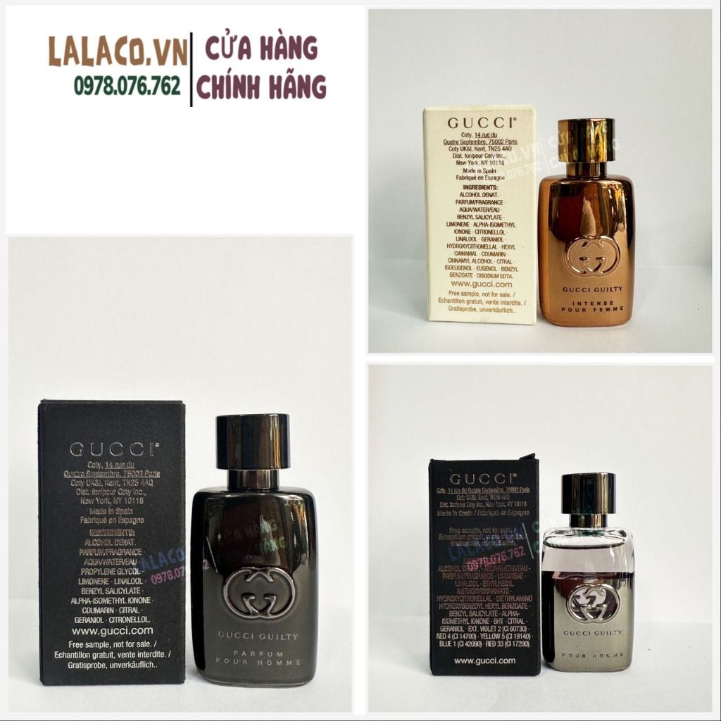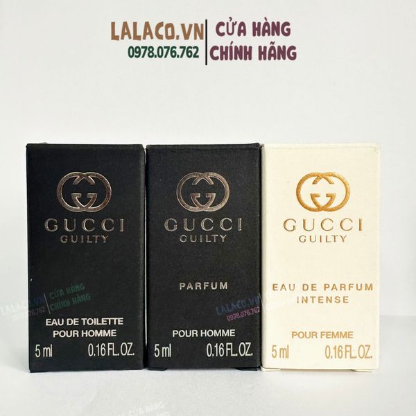 - [Mini] Gucci Guilty Pour Femme Eau de Toilette 5ml: hiên bản dành cho nữ giới được làm như bức tranh vẽ một cô gái xinh đẹp, quyến rũ. Mở đầu với hương Cam chanh tươi tắn cùng hương Trái cây mọng căng, ngọt dịu từ Quả Đào và Mâm xôi, gợi ra những nét nữ tính đáng yêu của lần gặp đầu với cô gái Gucci Guilty EDT. Dậy hương và kích thích khứu giác một chút bằng Tiêu hồng, sự nữ tính xinh đẹp trong mùi hương được đẩy lên đỉnh cùng một vườn hoa, đóa hoa Tử đinh hương tím phớt đầy phấn trên nền Hoa trắng, Hoa đỏ đầy màu sắc.