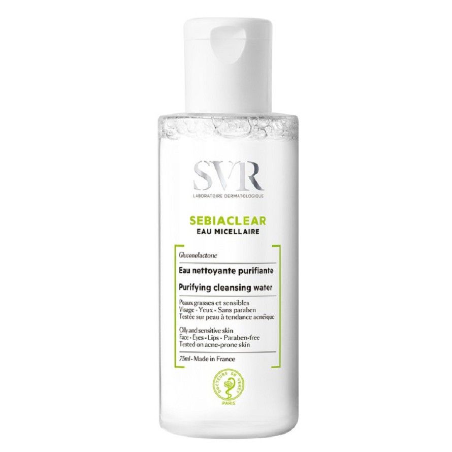 - SVR Sebiaclear Eau Micellaire 75ml (Nước tẩy trang) giúp làm sạch, rửa và tẩy lớp trang điểm chỉ trong 1 bước, thậm chí là lớp trang điểm không thấm nước. Sản phẩm còn giúp loại trừ cặn bẩn và bã nhờn dư thừa mà không làm khô da, giúp làn da sạch và tươi mát. Một trải nghiệm thật sự tươi mới !