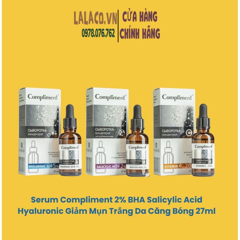 Serum Compliment 2% BHA Salicylic Acid Hyaluronic Acid B5 5% Vitamin C 20% Làm Sạch Da, Giảm Mụn Trắng Da Căng Bóng 27ml